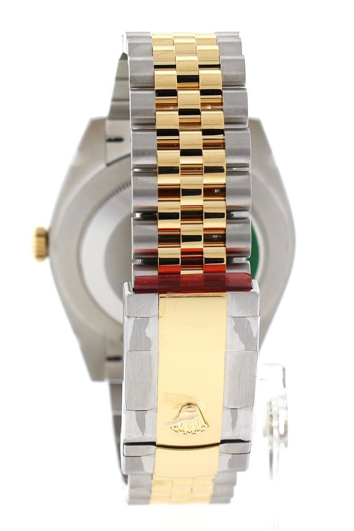 Stainless steel and 18k yellow gold case with a stainless steel and 18k yellow gold Rolex Jubliee?bracelet. Fixed - fluted 18k yellow gold bezel. Black dial with yellow gold-tone hands and index hour markers. Minute markers around the outer rim. Dial Type: Analog. Date display at the 3 o'clock position. Rolex Calibre 3235 automatic movement with about 70 hours of power reserve. Scratch resistant sapphire crystal. Screw down crown. Solid case back. Case size: 41 mm. Round case shape. Oysterlock clasp. Water resistant at 100 meters / 330 feet. Functions: date, hour, minute, second. Luxury watch style. Watch label: Swiss Made. Rolex Datejust 41 Black Dial Steel and 18K Yellow Gold Oyster Men's Watch.?126333