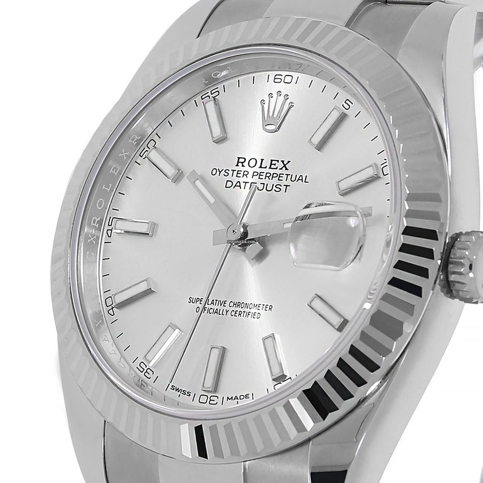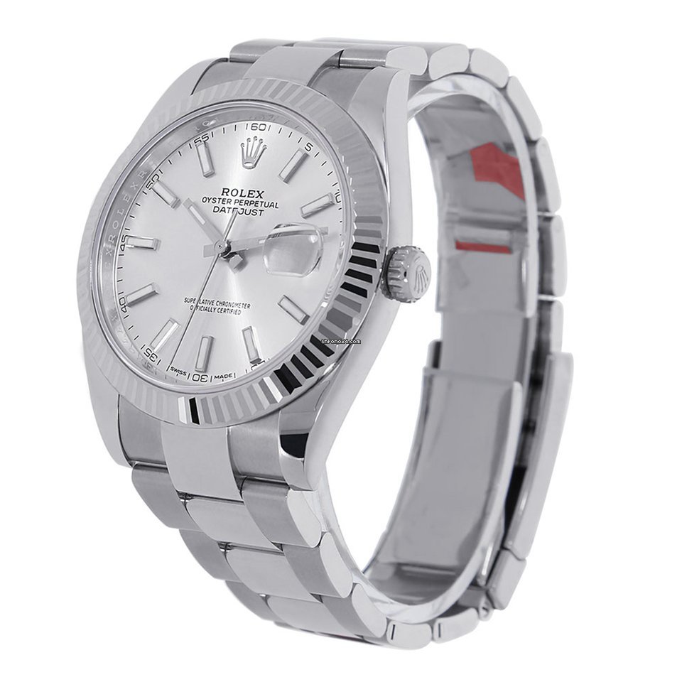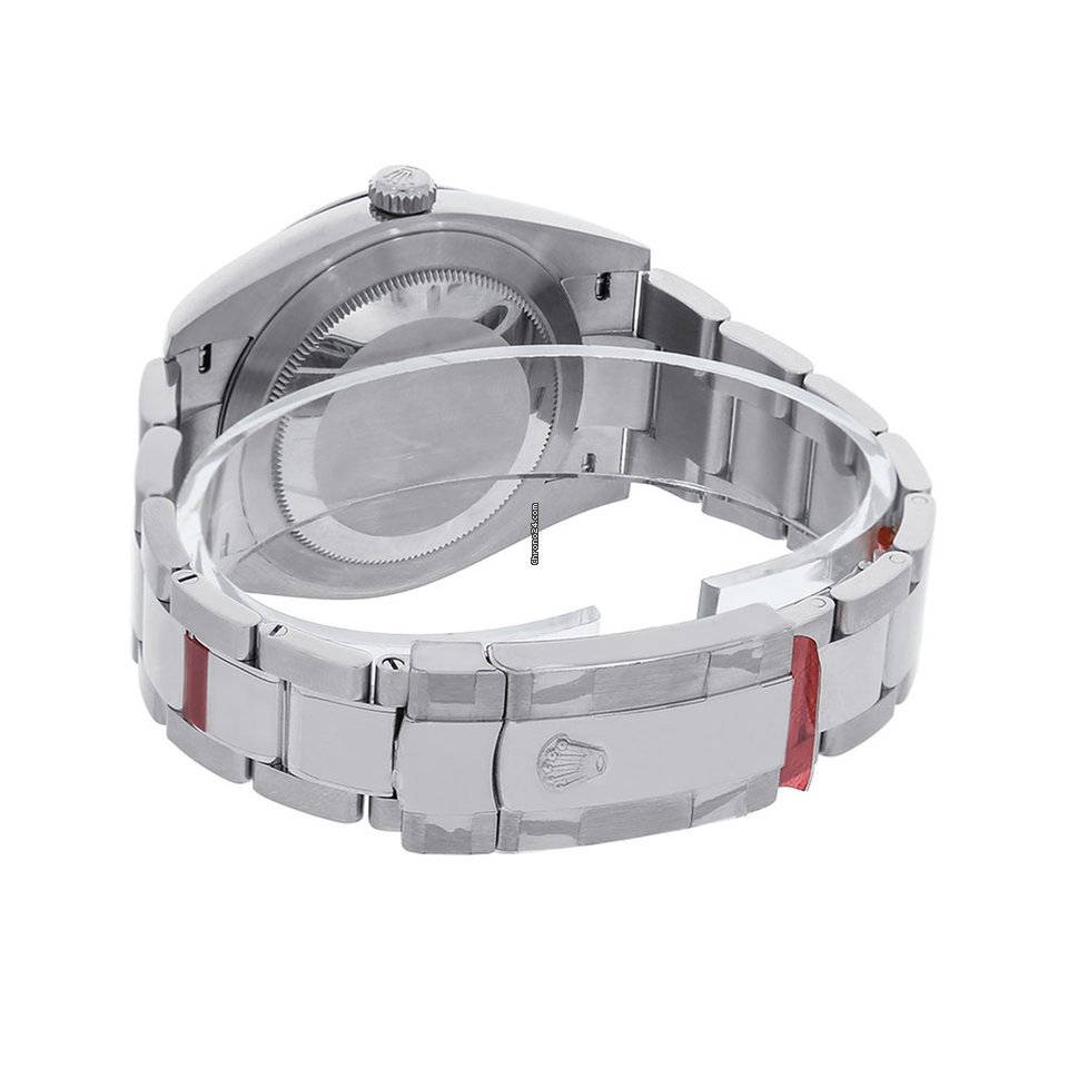The 116334 Datejust from Rolex has a design that permeates brilliance and luxury at its full peak. The Datejust II 116334 has a stainless-steel case that is 41mm in diameter with a monobloc middle, screw-down case and a winding crown. The 116334 Datejust has a fluted white gold bezel, a scratch resistant sapphire and a cyclops lens over the date. The dial is silver tone colored with index hour markers, a date window and steel hands. The Rolex 116334 timekeeping is powered by the self-winding 3136 caliber with date functionality and a power reserve of 48 hours. The 116334 case is paired with a stainless-steel oyster bracelet that has a fold over clasp. It has a water resistance of 100 meters (330 feet).