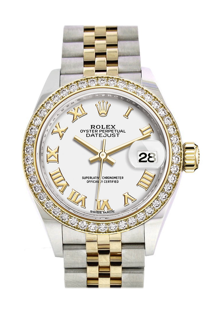 Rolex Datejust 28 White Roman Dial Diamond Bezel Yellow Gold Jubilee Ladies Watch 279383RBR 279383