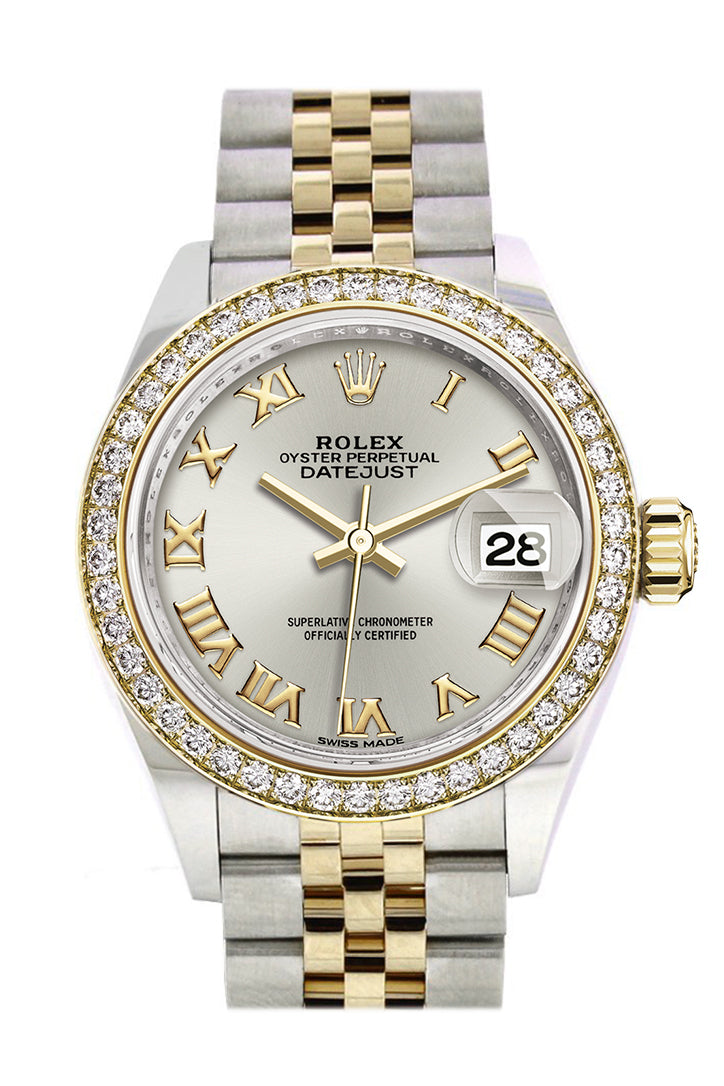 Rolex Datejust 28 Silver Roman Dial Diamond Bezel Yellow Gold Jubilee Ladies Watch 279383RBR 279383