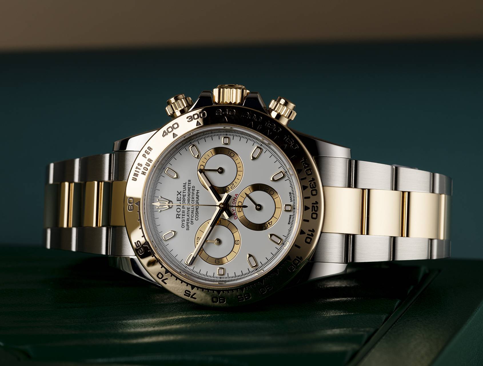Rolex Daytona Cosmograph (116503) self - winding automatic watch, features a 40mm stainless steel case with an 18k yellow gold bezel surrounding a white dial on a stainless steel and 18k yellow gold Oyster bracelet with folding buckle.
