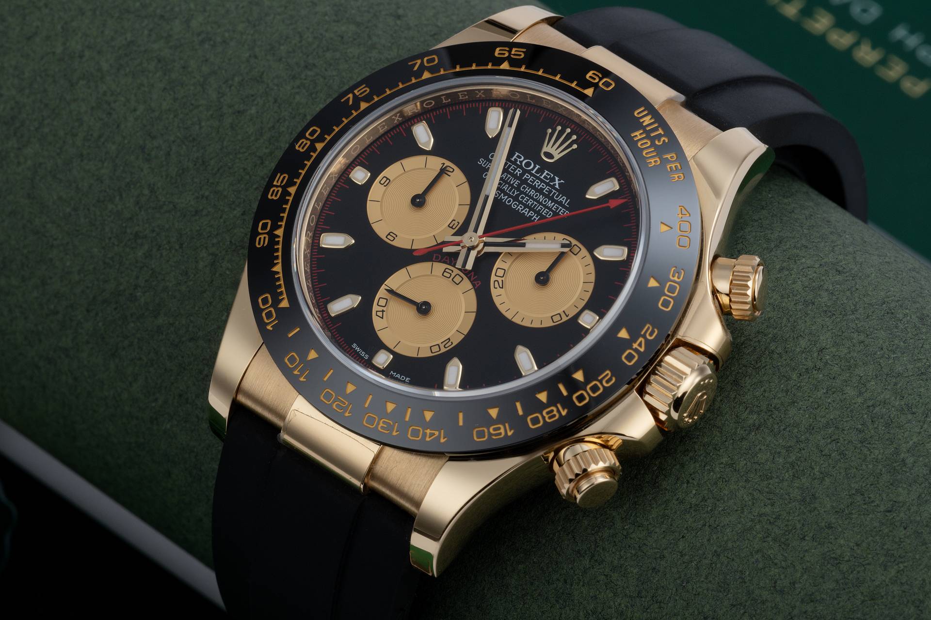 A key part of the model��s identity is the bezel moulded with a tachymetric scale for measuring average speeds of up to 400 miles or kilometres per hour. Blending high technology with sleek aesthetics, the black bezel is reminiscent of the 1965 model that was fitted with a black Plexiglas bezel insert.