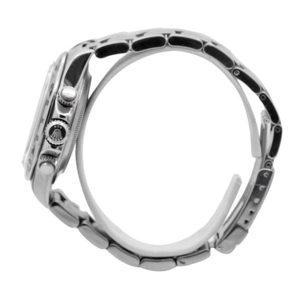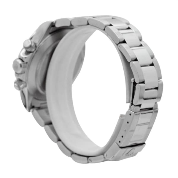 Men’s Rolex Daytona Zenith Cosmograph, 40mm, Stainless Steel watch. White Dial with black-rimmed subsidiary dials. It has applied luminous "boat" baton white gold hour index markers, luminous white gold baton hands, and a center sweep chronograph hand with an arrow pointer. Around the perimeter is a minute/one-fifth seconds track. There are three subsidiary dials, including a running seconds register at 9 o'clock, a 12-hour totalizer at 6 o'clock, and there is a 30-minute totalizer at 3 o'clock. There is a Triplock winding crown protected by shoulder crown guards, and there are screw-down round chronograph pushbuttons. It has a screw-down solid case back and a scratch-resistant sapphire crystal. The wide fixed Stainless Steel bezel with a tachymeter scale. The movement is mechanical self-winding Zenith El Primero caliber 4030 movements with 31 jewels and 54 hours of power reserve. The Stainless steel Oyster bracelet with Oysterlock clasp. The water resistance is up to 100 meters/330 feet.