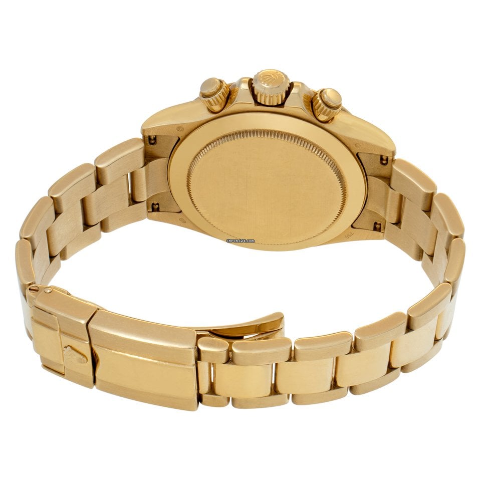 Rolex Daytona Yellow Gold Mother of Pearl Diamond Dial Mens Watch 116528 Box Card. Officially certified chronometer self-winding movement. Rhodium-plated, oeil-de-perdrix decoration, straight line lever escapement, monometallic balance adjusted to 5 positions, shock absorber, self-compensating free sprung Breguet balance spring, Microstella regulating screws, hack mechanism. 18K yellow gold case 40.0 mm in diameter. Special screw-down push buttons. Triplock winding crown protected by the crown guards. 18K yellow gold tachymeter engraved bezel. Scratch resistant sapphire crystal. Mother of pearl MOP dial with original Rolex factory diamond hour markers. Outer 1/5th seconds track. Gold outlined subsidiary dials for the seconds, the 12-hour and 30-minute registers. Luminous yellow gold baton hands. 18K yellow gold oyster bracelet with flip-lock clasp. Will fit up to 7 3/4" wrist. Mint condition. |