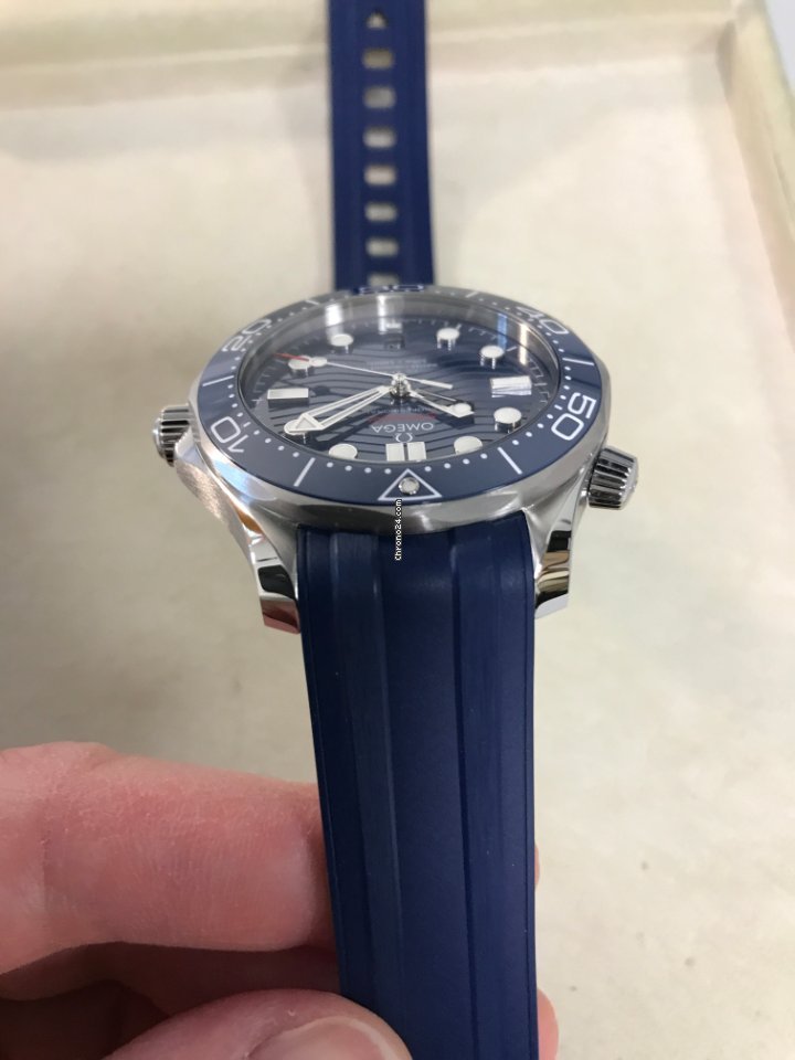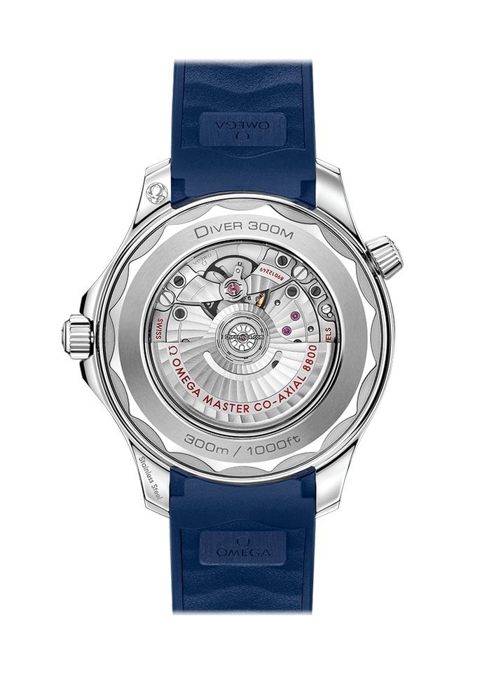 The watch is presented on a blue rubber strap and is driven by the OMEGA Master Chronometer Calibre 8800, which can be seen through the sapphire-crystal on the wave-edged case back.