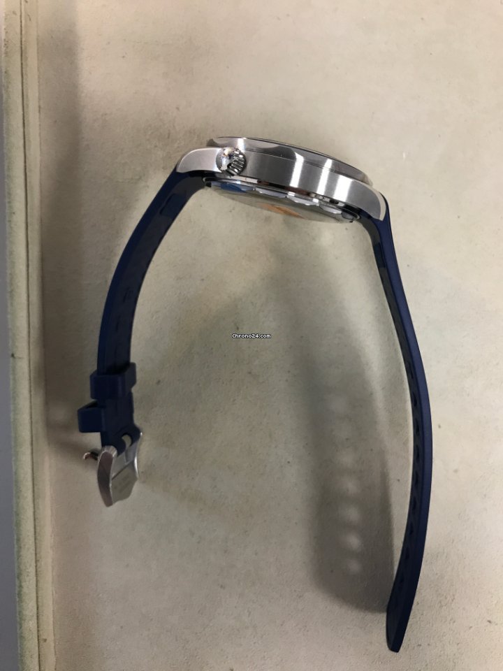 This 42 mm model is crafted from stainless steel and includes a blue ceramic bezel with a white enamel diving scale. The dial is also polished blue ceramic and features laser-engraved waves and a date window at 6 o'clock.