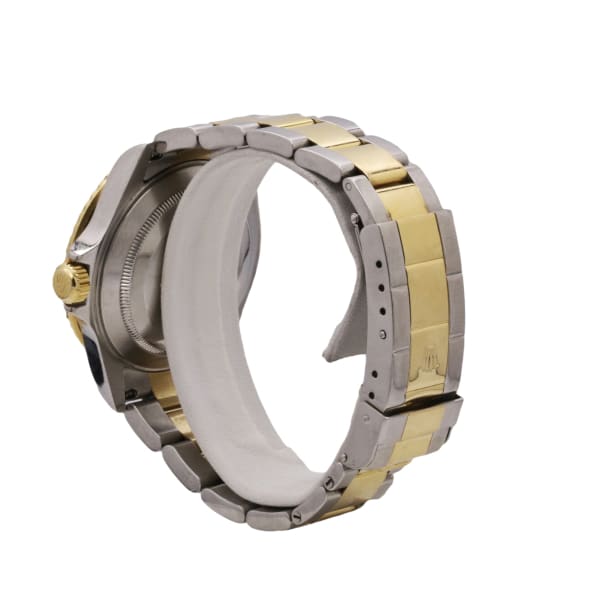 Pre-owned Rolex Submariner, 40mm, 18k Yellow Gold and Stainless Steel Watch. Blue Dial with dots and indices as hour markers. Blue Chromalight Luminescent Hands and Hour Markers. The date displayed under the Cyclops lens in the window at 3 o'clock with an instantaneous date setting. Stop-seconds for precise time setting. A scratch-resistant sapphire crystal protects the dial. Screw-down crown with Triplock triple waterproofness system. Screw-down solid case back. Solid 18k yellow gold unidirectional rotating bezel with blue Cerachrom ceramic bezel insert with a 60-minute scale that has gold-coated numerals and graduations. The watch powered by the Rolex Caliber 3135 self-winding certified movement, which boasts a 48-hour power reserve, and contains 31 jewels. Presented in Oyster bracelet on polished solid 18k yellow gold and brushed stainless steel with Oysterlock deployment buckle with Glidelock extension system. The water resistance is up to 300m/1000ft.