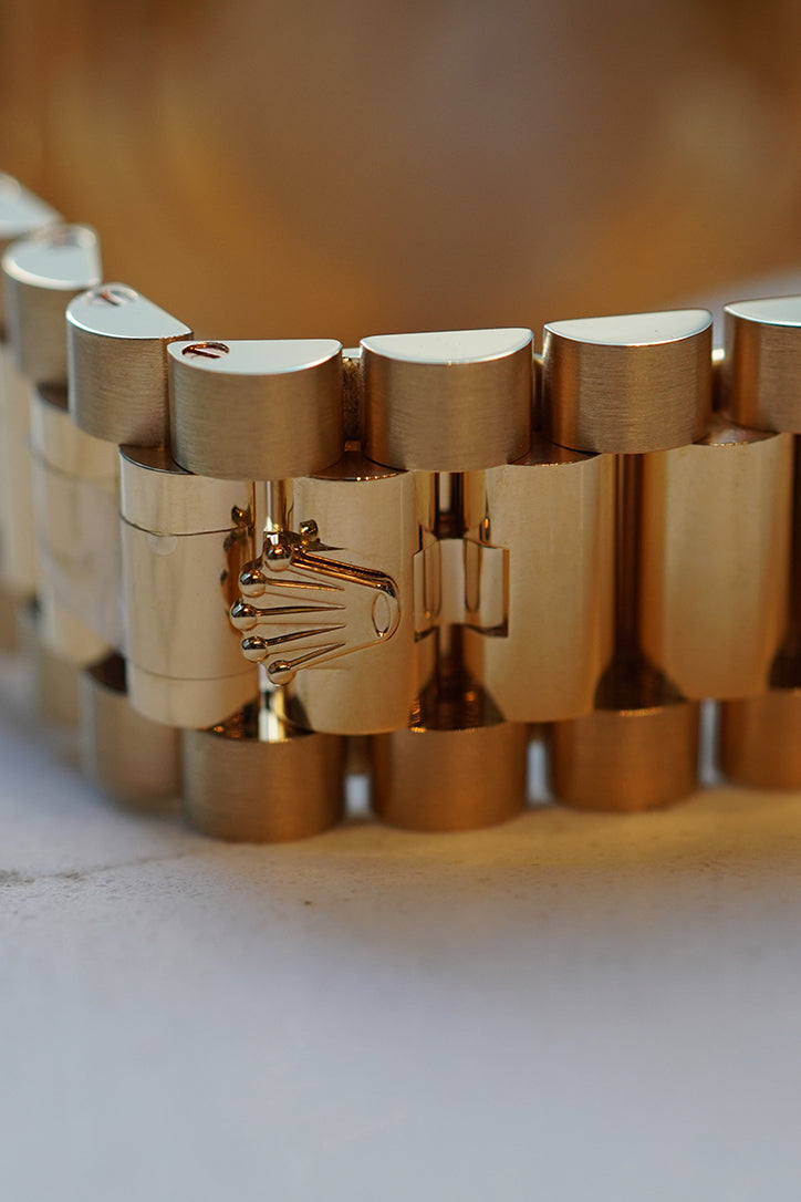 Rolex Yellow Gold Day-Date 36 Watch - Diamond Bezel - Turquoise Dial - President Bracelet 36mm 18K yellow gold case, screw-down back, screw-down crown with twinlock double waterproofness system, bezel set with 52 diamonds, scratch-resistant sapphire crystal with cyclops lens over the date, Turquoise dial, Diamond hour markers, Rolex calibre 3255 perpetual self-winding movement with centre hour, minute and seconds hands, instantaneous day and date in apertures, unrestricted rapid-setting, and stop-seconds for precise time setting, approximately 70 hours of power reserve, 18K yellow gold President bracelet with semi-circular three-piece links, concealed folding Crownclasp buckle. Waterproof to 100 meters. 128348RBR-0037 128348RBR