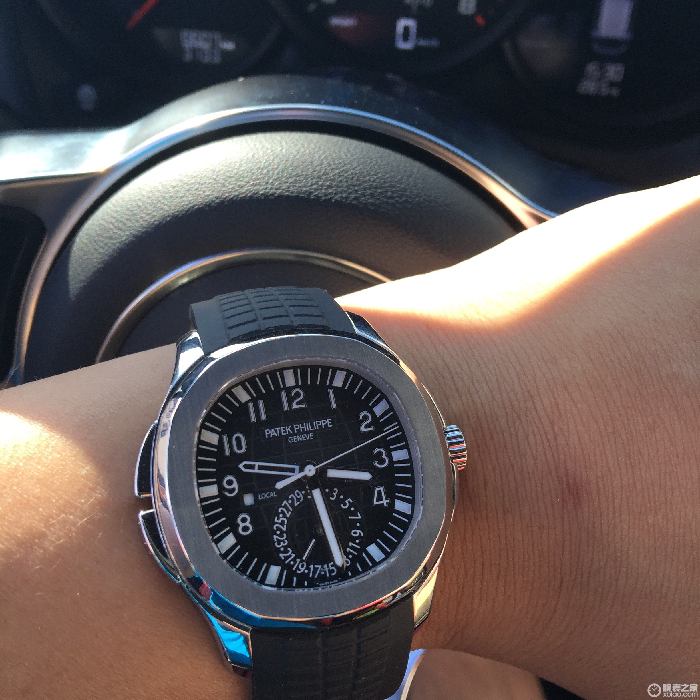 Stainless steel case with a black rubber strap. Fixed bezel. Black embossed dial with luminous hands and index hour markers. Minute markers around the outer rim. Dial Type: Analog. Date display at the 6 o'clock position. Date sub-dials. Patek Philippe Calibre 324 S C FUS automatic movement with about 35-45 hours of power reserve. Scratch resistant sapphire crystal. Case size: 40.8 mm. Round case shape. Water resistant at 120 meters / 400 feet. Functions: date, second time zone, hour, minute, second, day/night indicator. Luxury watch style. Watch label: Swiss Made. Item Variations: 5164A 001, 5164A.001, 5164A001. Patek Philippe Aquanaut Dual Time Black Dial Automatic Mens Watch 5164A-001