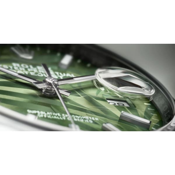 Unworn Rolex Datejust 36 Stainless Steel watch. They have Olive green, palm motif Dial, index hour markers fashioned from 18k gold. Highly legible Chromalight display with long-lasting blue luminescence. Monobloc middle case, solid screw-down case back, and winding crown. Scratch-resistant sapphire, Cyclops lens over the date. The domed Stainless Steel bezel. The movement is mechanical self-winding, caliber 3235 with 31 jewels and 70 hours of power reserve. The Oyster Bracelet is Stainless Steel. Folding Oysterclasp with Easylink 5 mm comfort extension link. The water resistance is up to 100m/330ft. The Watch comes complete with store papers & box. Will include 3 years Store Warranty.
