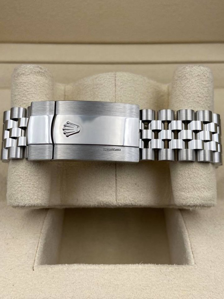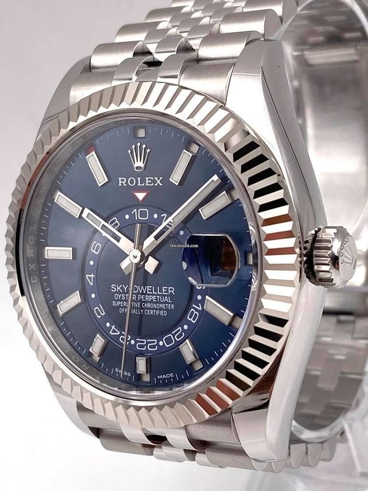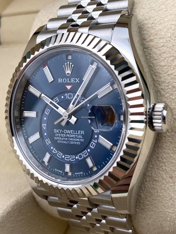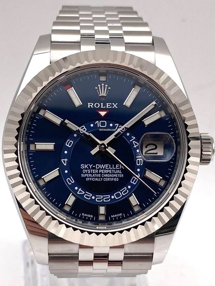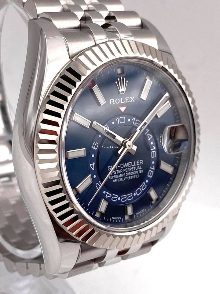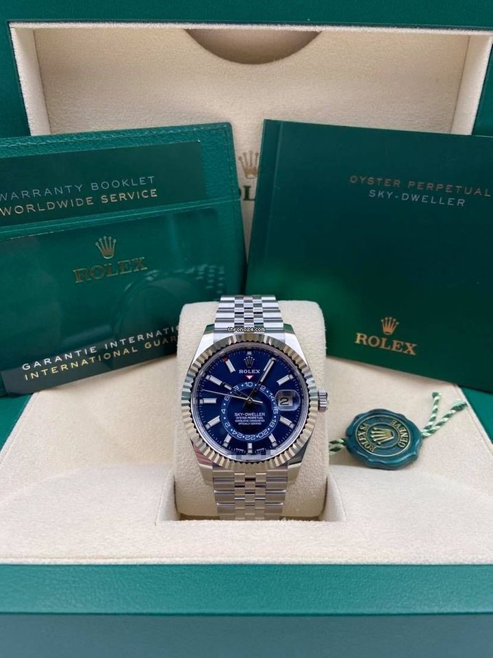 This watch is 100% Unworn and comes with the Original Box, Booklets, Green Chronometer Tag, and Warranty Card. The watch does not come with a Bezel Protector or the White Serial Tag. The Warranty Card was named and dated and all of the stickers were removed at the time of the original purchase from the Rolex Authorized Dealer. The watch may have also been sized at the time of the original purchase, however the watch was never worn and comes with all links that come standard on the Rolex Skydweller Jubilee models.