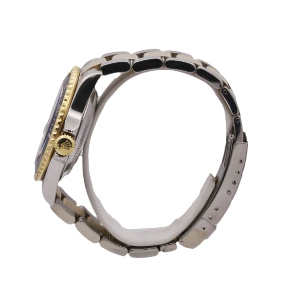 Rolex Submariner Date Watch, 40mm, Two-Tone Stainless Steel, and 18k Yellow Gold. Black Dial with applied polished 18k Yellow Gold rimmed hour markers with luminescent fill. Mercedes-style polished 18k Yellow Gold hands with luminescent fill. Highly legible Chromalight display with long-lasting blue luminescence. Patented Polished 18kt yellow gold crown “Triplock" locking ensuring that the crown screws-down onto the Oyster case as securely as a submarine hatch. Scratch-resistant sapphire, Cyclops lens over the date. The date window displayed at the 3 o'clock position. Unidirectional rotatable 60-minute graduated bezel of polished 18k Yellow Gold rimmed with a ribbed edge for a sure grip. Black "Cerachrom" bezel insert, made of highly durable ceramic that is extremely hard that is highly scratch-resistant, has excellent corrosion-resistant properties and is unaffected by ultraviolet rays so the color will not fade. Matte Yellow Gold numbers and graduation indexes with luminous dot. The movement is mechanical self-winding, caliber 3135 with 31 jewels, and 48 hours of power reserve. The watch presented on a Stainless Steel and 18k Yellow Gold Oyster bracelet with folding Oysterlock safety clasp with Rolex Glidelock extension system. The water resistance is up to 300m/1,000ft.
